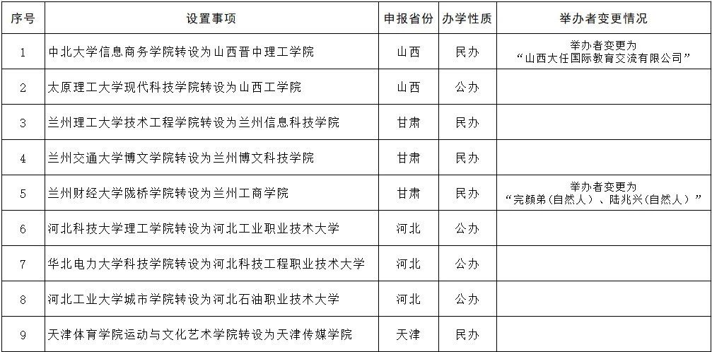 教育部發(fā)展規(guī)劃司表示,根據(jù)《高等教育法》《普通高等學(xué)校設(shè)置暫行條例》《普通本科學(xué)校設(shè)置暫行規(guī)定》和《關(guān)于加快推進(jìn)獨(dú)立學(xué)院轉(zhuǎn)設(shè)工作的實(shí)施方案》等法律法規(guī)政策規(guī)定,經(jīng)第七屆全國(guó)高等學(xué)校設(shè)置評(píng)議委員會(huì)專家考察和評(píng)議,并經(jīng)黨組會(huì)審議,