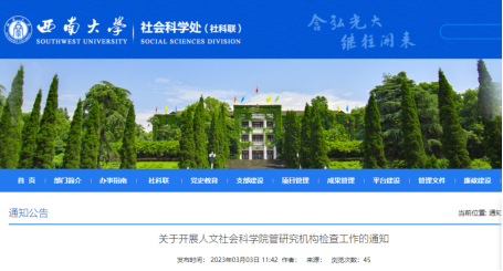 3月3日,西南大學(xué)社會(huì)科學(xué)處發(fā)布《關(guān)于開(kāi)展人文社會(huì)科學(xué)院管研究機(jī)構(gòu)檢查工作的通知》(以下簡(jiǎn)稱(chēng)《通知》),對(duì)學(xué)校人文社會(huì)科學(xué)領(lǐng)域院管研究機(jī)構(gòu)開(kāi)展檢查工作。