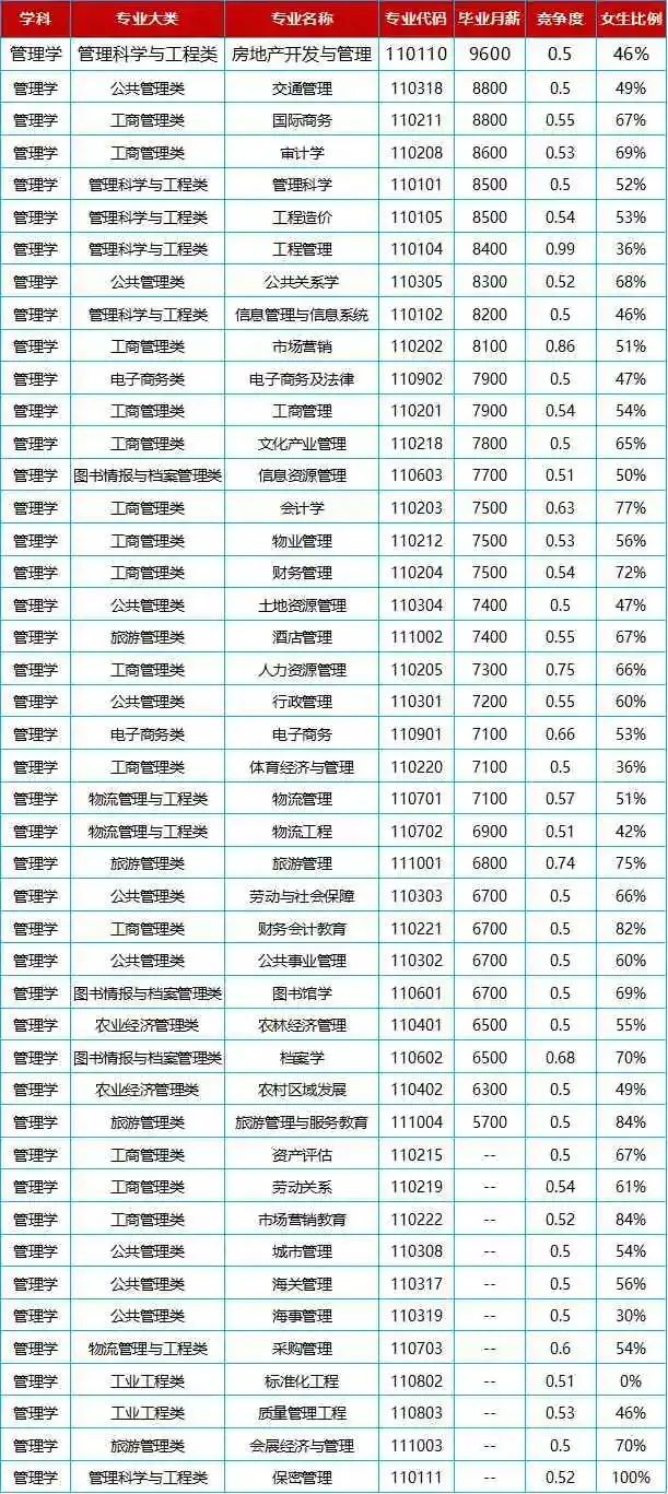老師是很多家長喜歡的職業(yè),他們都希望自己的孩子可以有一份穩(wěn)定、有保障的工作,而且老師有寒暑假,因此師范類專業(yè)成為女生報考的熱門專業(yè)。師范類專業(yè)包括很多,如數(shù)學(xué)、漢語言文學(xué)、英語、日語、學(xué)前教育等。一般而言,護理學(xué)專業(yè)的女生是特別多的,基本上一個班級95%以上都是女生。不僅如此,許多教護理專業(yè)的老師也大多都是女生。我國男生當(dāng)護士的還是比較少見的。據(jù)說有些會計專業(yè)的班級男女比例比護理學(xué)的還夸張。甚至可以說是一門女生的學(xué)科。過去會計專業(yè)非常熱門,但是近幾年會計行業(yè)逐漸趨于飽和狀態(tài),但是還是不能阻止家長和考生對它的喜愛。小語種近幾年都比較熱門,小語種專業(yè)也是近幾年比較熱門的一個專業(yè),而且女生學(xué)習(xí)語言類專業(yè),有天生的優(yōu)勢。如果能力較強,還可以到一些中外合資的企業(yè)從事翻譯的工作,工資待遇也比較可觀。全國普通高校就業(yè)狀況報告中,畢業(yè)生初次就業(yè)率數(shù)據(jù)統(tǒng)計,德語、法語、西班牙語排名前10位。管理學(xué)也是女生容易扎堆報考的專業(yè)。女生相對比較細心,在決策運營方面的統(tǒng)籌管理更有優(yōu)勢一些。像這種所謂的“坐辦公室”的職業(yè),也是家長比較喜歡的。管理學(xué)包括酒店管理、行政管理、人力資源管理、工商管理、市場營銷等。其實會計學(xué)也屬于管理學(xué)大類,但是比較典型,就單獨拎出來說了。管理學(xué)45個專業(yè)畢業(yè)生薪酬一覽: