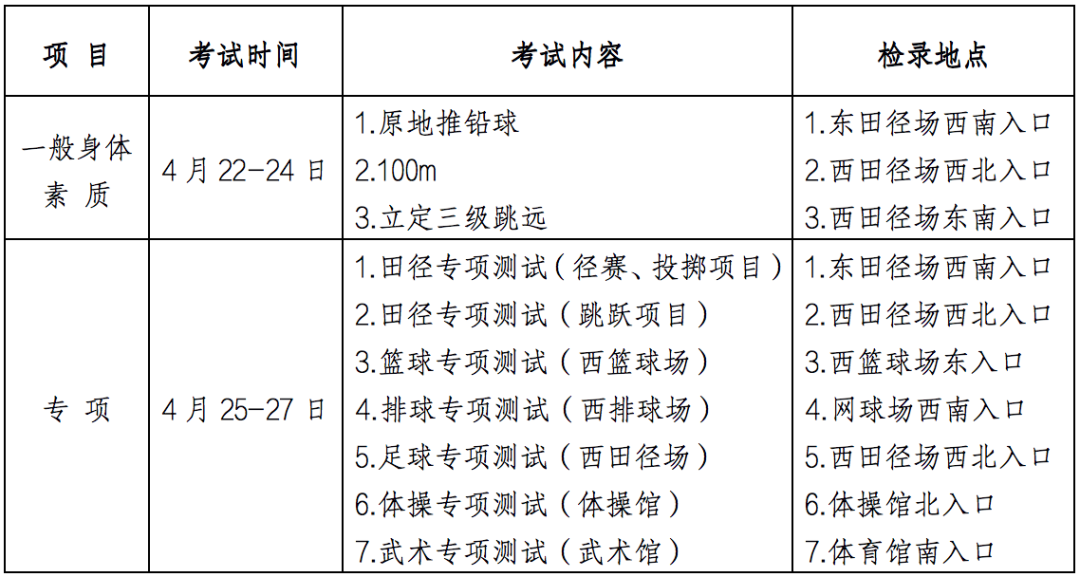 4.測試采用分組輪換、集中測試的方式進(jìn)行,4月22-24日為一般身體素質(zhì)測試,4月25-27日為專項測試,考生具體考試時間以《報名登記表》為準(zhǔn)。