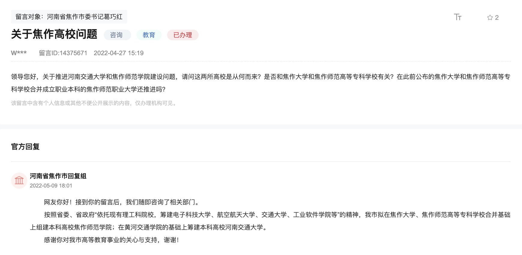 2022年5月,河南省焦作市回復組在人民網領導留言板回復時提到,我市擬在焦作大學、焦作師范高等專科學校合并基礎上組建本科高校焦作師范學院。