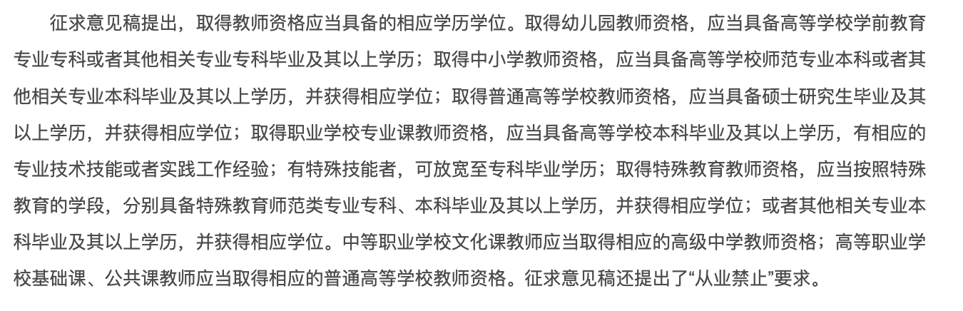 2021年11月,教育部針對《中華人民共和國教師法(修訂草案)》公開征求意見,其中提出,取得中小學教師資格,應當具備高等學校師范專業(yè)本科或者其他相關專業(yè)本科畢業(yè)及其以上學歷,并獲得相應學位。
