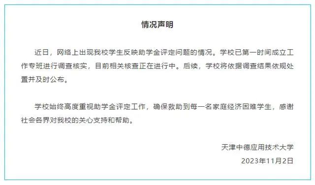 經(jīng)調(diào)查,自9月18日有關(guān)同學(xué)對班級困難生認(rèn)定提出異議以來,校院兩級資助工作負(fù)責(zé)人保持與該生溝通,耐心傾聽其意見和訴求,表示學(xué)校了解其實(shí)際困難情況,按照規(guī)定其符合獲得國家助學(xué)金的條件,具體等級按照相關(guān)程序綜合評定后確定。該生自入學(xué)以來,生源地政府及相關(guān)親屬給予了學(xué)費(fèi)和生活費(fèi)保障,大一、大二兩個(gè)學(xué)年均獲得二等國家助學(xué)金,并已全部發(fā)放到位。大三學(xué)年綜合評定擬獲二等國家助學(xué)金,學(xué)院已于10月24日-10月27日公示評定結(jié)果,不存在國家助學(xué)金名額遭“擠占”情況。