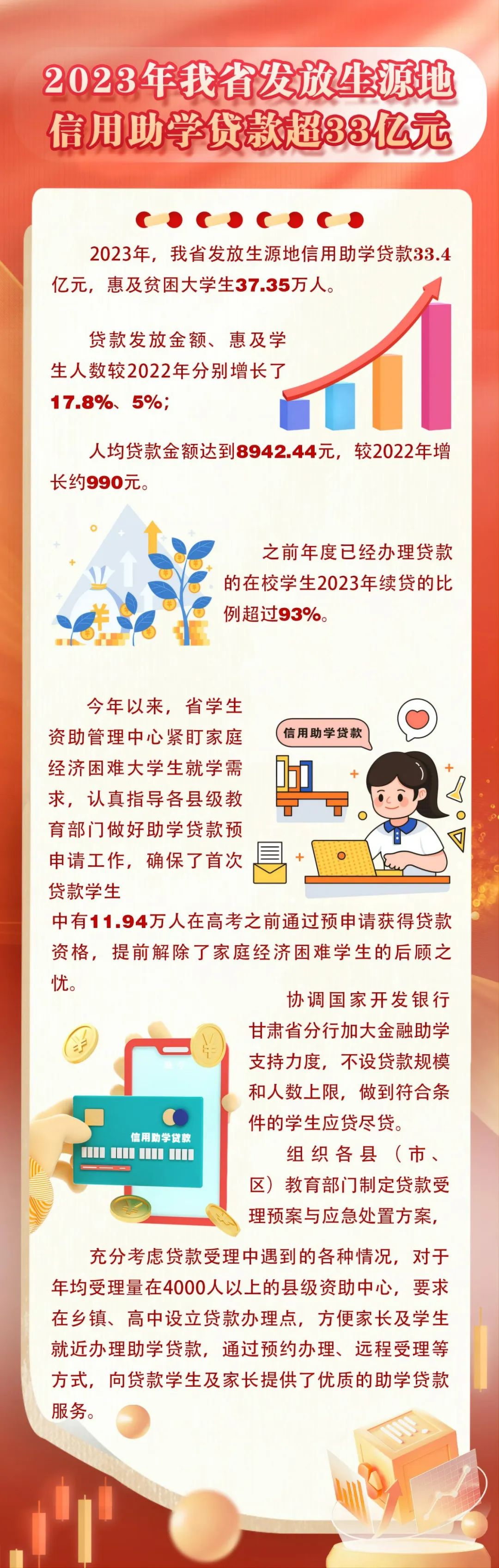 近日,記者從甘肅省教育廳了解到,2023年,甘肅發(fā)放生源地信用助學(xué)貸款33.4億元,惠及貧困大學(xué)生37.35萬(wàn)人。貸款發(fā)放金額、惠及學(xué)生人數(shù)較2022年分別增長(zhǎng)了17.8%、5%;人均貸款金額達(dá)到8942.44元,較2022年增長(zhǎng)約990元。