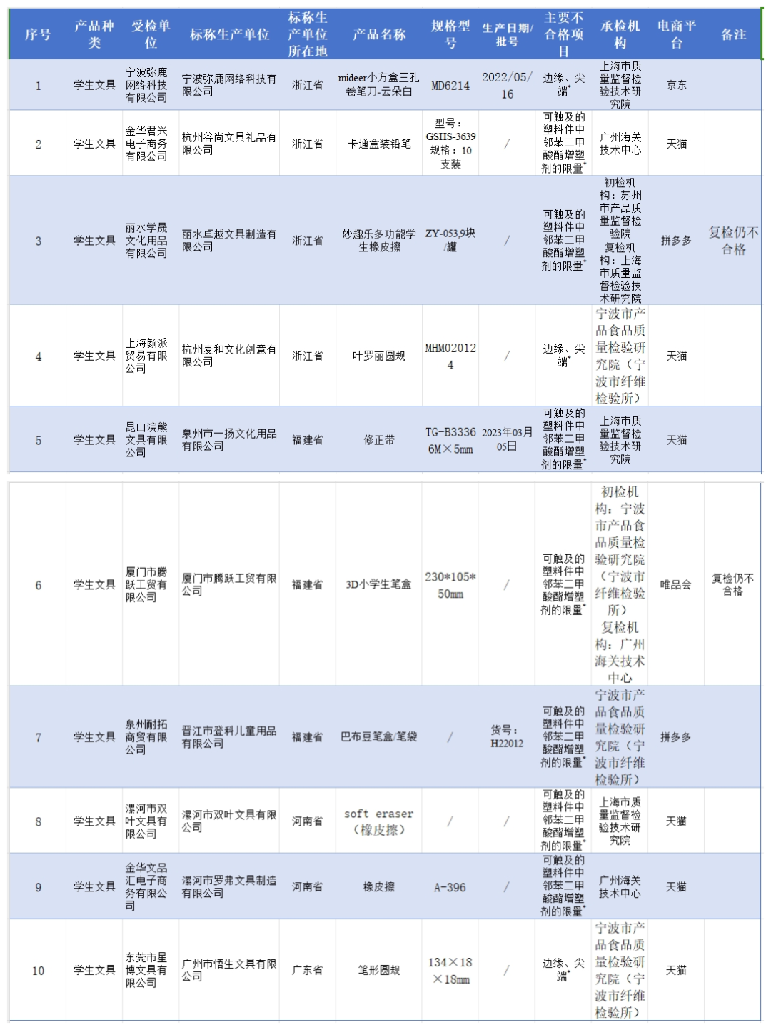 1. 標(biāo)稱寧波彌鹿網(wǎng)絡(luò)科技有限公司生產(chǎn)的mideer小方盒三孔卷筆刀-云朵白,規(guī)格型號(hào):MD6214,主要不合格項(xiàng)目:邊緣、尖端;2. 標(biāo)稱杭州谷尚文具禮品有限公司生產(chǎn)的生產(chǎn)的卡通盒裝鉛筆,型號(hào):GSHS-3639,主要不合格項(xiàng)目:可觸及的塑料件中鄰苯二甲酸酯增塑劑的限量;3. 標(biāo)稱麗水卓越文具制造有限公司生產(chǎn)的妙趣樂多功能學(xué)生橡皮擦,型號(hào):ZY-053,主要不合格項(xiàng)目:可觸及的塑料件中鄰苯二甲酸酯增塑劑的限量,備注:復(fù)檢仍不合格;4. 標(biāo)稱杭州麥和文化創(chuàng)意有限公司生產(chǎn)的葉羅麗圓規(guī),規(guī)格型號(hào):MHM020124,主要不合格項(xiàng)目:邊緣、尖端;5. 標(biāo)稱泉州市一揚(yáng)文化用品有限公司生產(chǎn)的修正帶,規(guī)格型號(hào):TG-B3336 6M×5mm,主要不合格項(xiàng)目:可觸及的塑料件中鄰苯二甲酸酯增塑劑的限量;6. 標(biāo)稱廈門市騰躍工貿(mào)有限公司生產(chǎn)的3D小學(xué)生筆盒,規(guī)格型號(hào):230*105*50mm,主要不合格項(xiàng)目:可觸及的塑料件中鄰苯二甲酸酯增塑劑的限量,備注:復(fù)檢仍不合格;7. 標(biāo)稱晉江市登科兒童用品有限公司生產(chǎn)的巴布豆筆盒/筆袋,貨號(hào):H22012,主要不合格項(xiàng)目:可觸及的塑料件中鄰苯二甲酸酯增塑劑的限量;8. 標(biāo)稱漯河市雙葉文具有限公司生產(chǎn)的soft eraser(橡皮擦),主要不合格項(xiàng)目:可觸及的塑料件中鄰苯二甲酸酯增塑劑的限量;9. 標(biāo)稱漯河市羅弗文具制造有限公司生產(chǎn)的橡皮擦,規(guī)格型號(hào):A-396,主要不合格項(xiàng)目:可觸及的塑料件中鄰苯二甲酸酯增塑劑的限量;10. 標(biāo)稱廣州市悟生文具有限公司生產(chǎn)的筆形圓規(guī),規(guī)格型號(hào):134×18×18mm,主要不合格項(xiàng)目:邊緣、尖端。