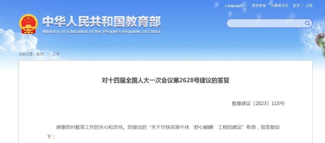 日前,教育部網(wǎng)站公布了對(duì)十四屆全國(guó)人大一次會(huì)議第2628號(hào)建議的答復(fù)。針對(duì)“關(guān)于盡快實(shí)施午休‘舒心躺睡’工程的建議”,教育部表示,充足的睡眠時(shí)間,對(duì)保障學(xué)生身心健康發(fā)展非常重要。下一步將繼續(xù)引導(dǎo)鼓勵(lì)支持有條件的地方,統(tǒng)籌現(xiàn)有辦學(xué)條件和設(shè)施設(shè)備,因地制宜創(chuàng)造學(xué)生午休條件,為學(xué)生身心健康發(fā)展提供有力保障。