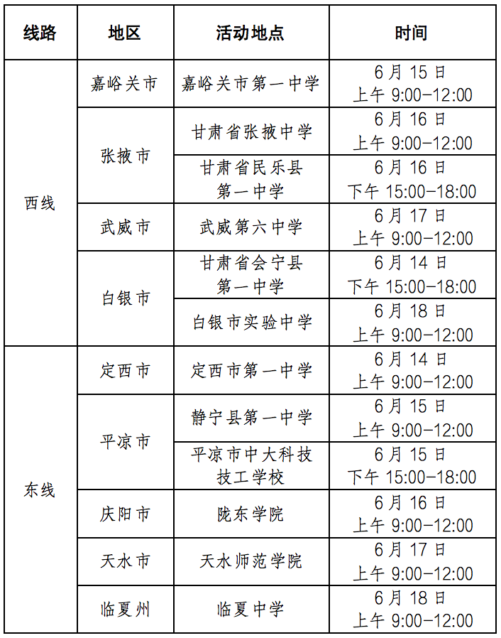 為推進(jìn)我省高考綜合改革順利落地,做好考生志愿填報(bào)咨詢服務(wù),幫助考生掌握高考綜合改革各項(xiàng)招生政策,了解招生院校辦學(xué)特色、專業(yè)優(yōu)勢(shì),助力隴原學(xué)子圓夢(mèng),甘肅省教育考試院和蘭州大學(xué)聯(lián)合有關(guān)高校舉辦2024年高校招生“隴原行”宣傳活動(dòng),赴我省部分市(州)、縣(市、區(qū))現(xiàn)場(chǎng)與考生面對(duì)面開展高考志愿政策宣講和報(bào)考咨詢服務(wù)。具體安排如下: