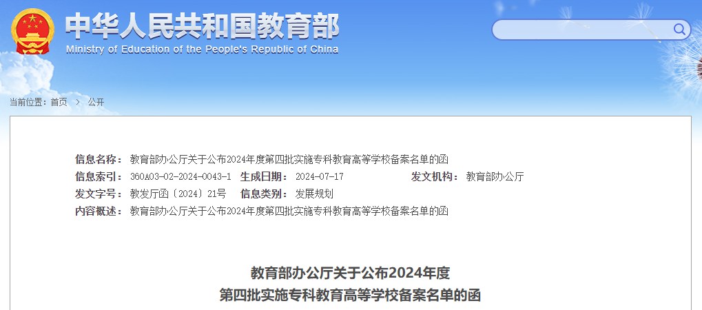 教育部辦公廳關(guān)于公布2024年度第四批實(shí)施專科教育高等學(xué)校備案名單的函