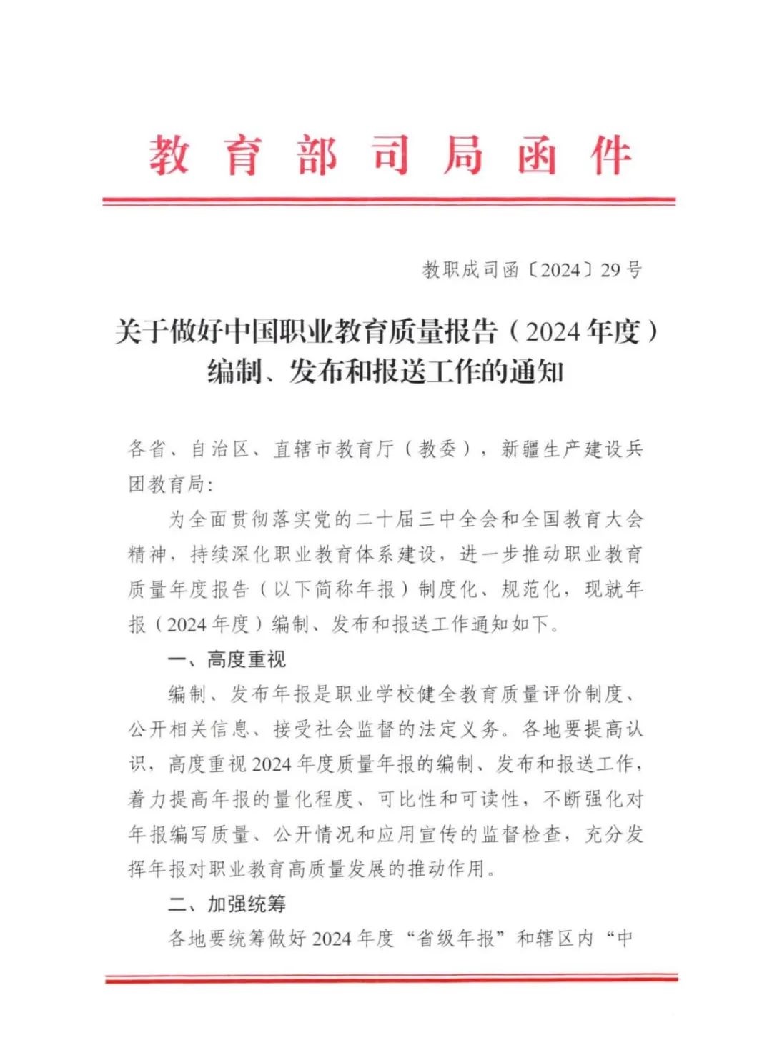 為全面貫徹黨的二十屆三中全會和全國教育大會精神,持續(xù)深化職業(yè)教育體系建設,教育部職業(yè)教育與成人教育司近日發(fā)布了《關于做好中國職業(yè)教育質量報告(2024年度)編制、發(fā)布和報送工作的通知》(教職成司函〔2024〕29號),以下簡稱《通知》。