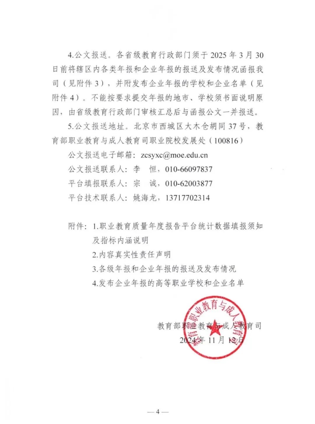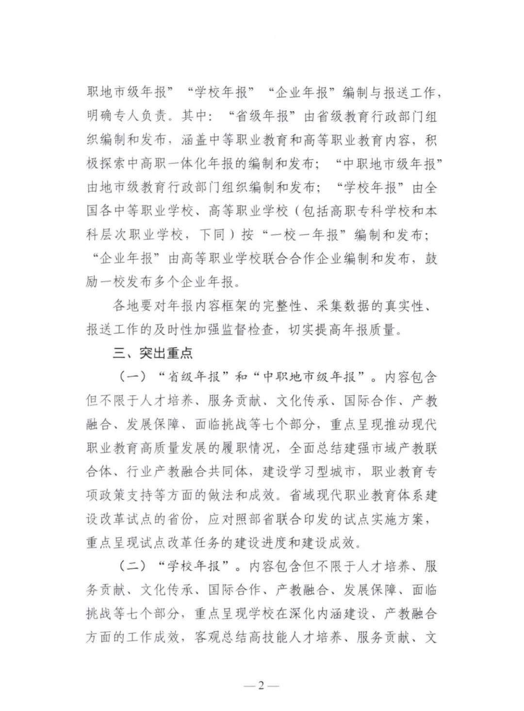 在統(tǒng)籌工作方面,《通知》要求各地統(tǒng)籌做好省級年報、中職地市級年報、學校年報和企業(yè)年報的編制與報送工作,并明確專人負責。省級年報由省級教育行政部門組織編制和發(fā)布,涵蓋中等職業(yè)教育和高等職業(yè)教育內容。中職地市級年報由地市級教育行政部門組織編制和發(fā)布。學校年報由全國各中等職業(yè)學校、高等職業(yè)學校按“一校一年報”編制和發(fā)布。企業(yè)年報由高等職業(yè)學校聯(lián)合合作企業(yè)編制和發(fā)布。