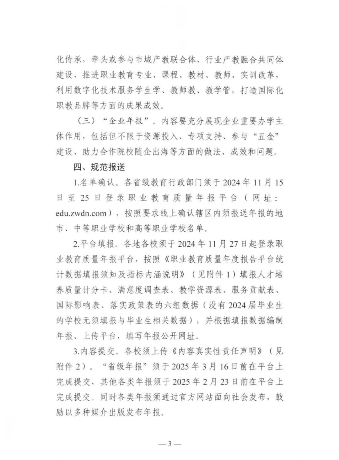 在規(guī)范報送方面,《通知》明確了名單確認、平臺填報、內容提交、公文報送等具體流程和時間節(jié)點。各省級教育行政部門須于2025年3月30日前將轄區(qū)內各類年報和企業(yè)年報的報送及發(fā)布情況函報教育部職業(yè)教育與成人教育司,并附發(fā)布企業(yè)年報的學校和企業(yè)名單。
