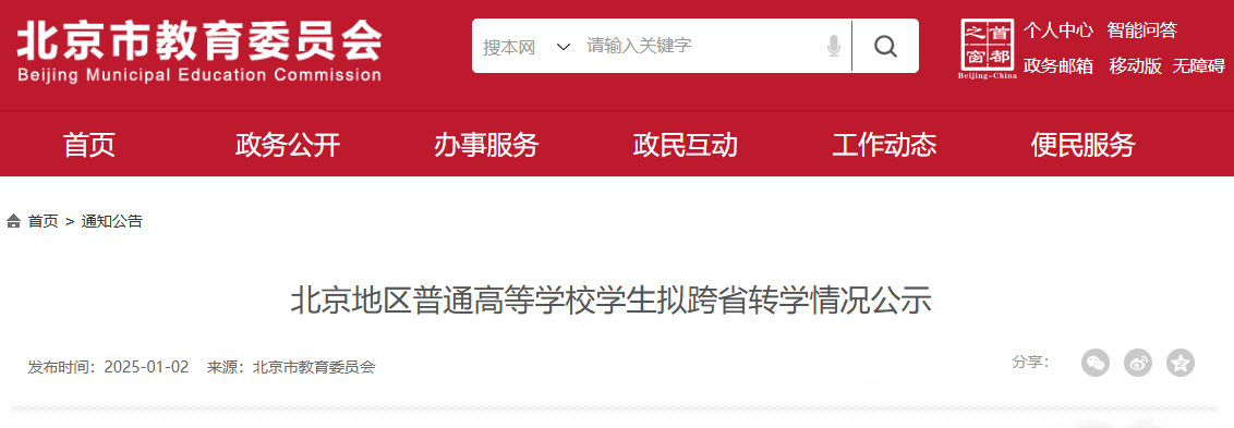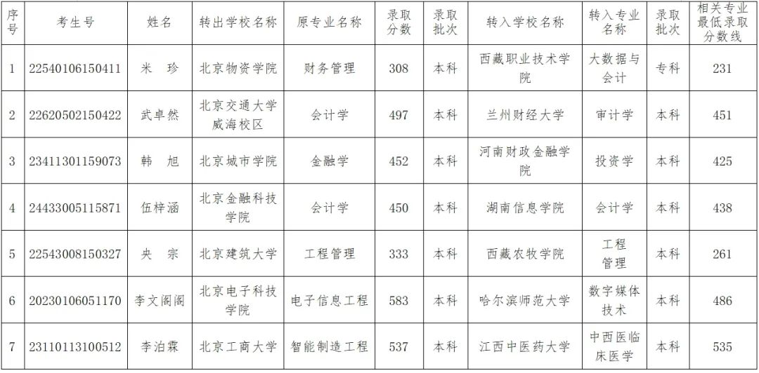 根據(jù)《北京市教育委員會關(guān)于做好普通高等學校學生轉(zhuǎn)學工作的意見》(京教學〔2017〕10號)關(guān)于轉(zhuǎn)學的規(guī)定,北京市教育委員會對高校報送的學生跨省轉(zhuǎn)學材料進行了初審、復核,現(xiàn)將米珍等7名學生擬轉(zhuǎn)學情況予以公示。公示期自2025年1月2日起至1月8日結(jié)束,共5個工作日。公示期內(nèi),如對擬轉(zhuǎn)學學生情況有異議的,可以書面形式提出,所反映情況要真實、具體、客觀。以單位名義提出異議的,須在材料上加蓋本單位公章,并注明聯(lián)系人、通訊地址和聯(lián)系電話;個人提出的異議,須在材料上簽署本人真實姓名,并寫明本人工作單位、單位通訊地址(或家庭住址)和聯(lián)系電話。不符合上述要求的材料,市教委將不予受理。
