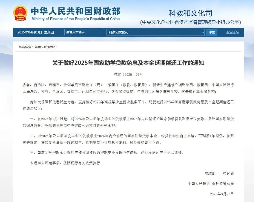 自2025年1月1日起,對(duì)2025年及以前年度畢業(yè)的貸款學(xué)生2025年內(nèi)應(yīng)償還的國(guó)家助學(xué)貸款利息予以免除,