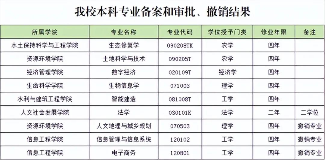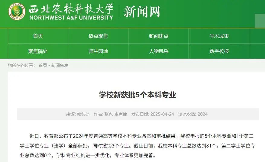 據(jù)西北農(nóng)林科技大學(xué)新聞網(wǎng)消息,西北農(nóng)林科技大學(xué)申報(bào)的5個(gè)本科專業(yè)和1個(gè)第二學(xué)士學(xué)位專業(yè)(法學(xué))全部獲批,同時(shí)撤銷3個(gè)專業(yè):人文地理與城鄉(xiāng)規(guī)劃、信息管理與信息系統(tǒng)、電子商務(wù)。截止目前,學(xué)校本科專業(yè)總數(shù)達(dá)到81個(gè),第二學(xué)士學(xué)位專業(yè)總數(shù)達(dá)到9個(gè),學(xué)科專業(yè)結(jié)構(gòu)進(jìn)一步優(yōu)化,專業(yè)體系更加完善。