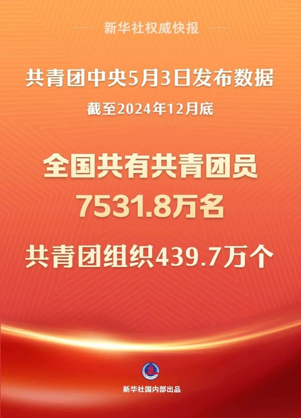 共青團(tuán)中央5月3日發(fā)布數(shù)據(jù)顯示,截至2024年12月底,全國共有共青團(tuán)員7531.8萬名,共青團(tuán)組織439.7萬個(gè)。2024年共發(fā)展團(tuán)員641.7萬名。