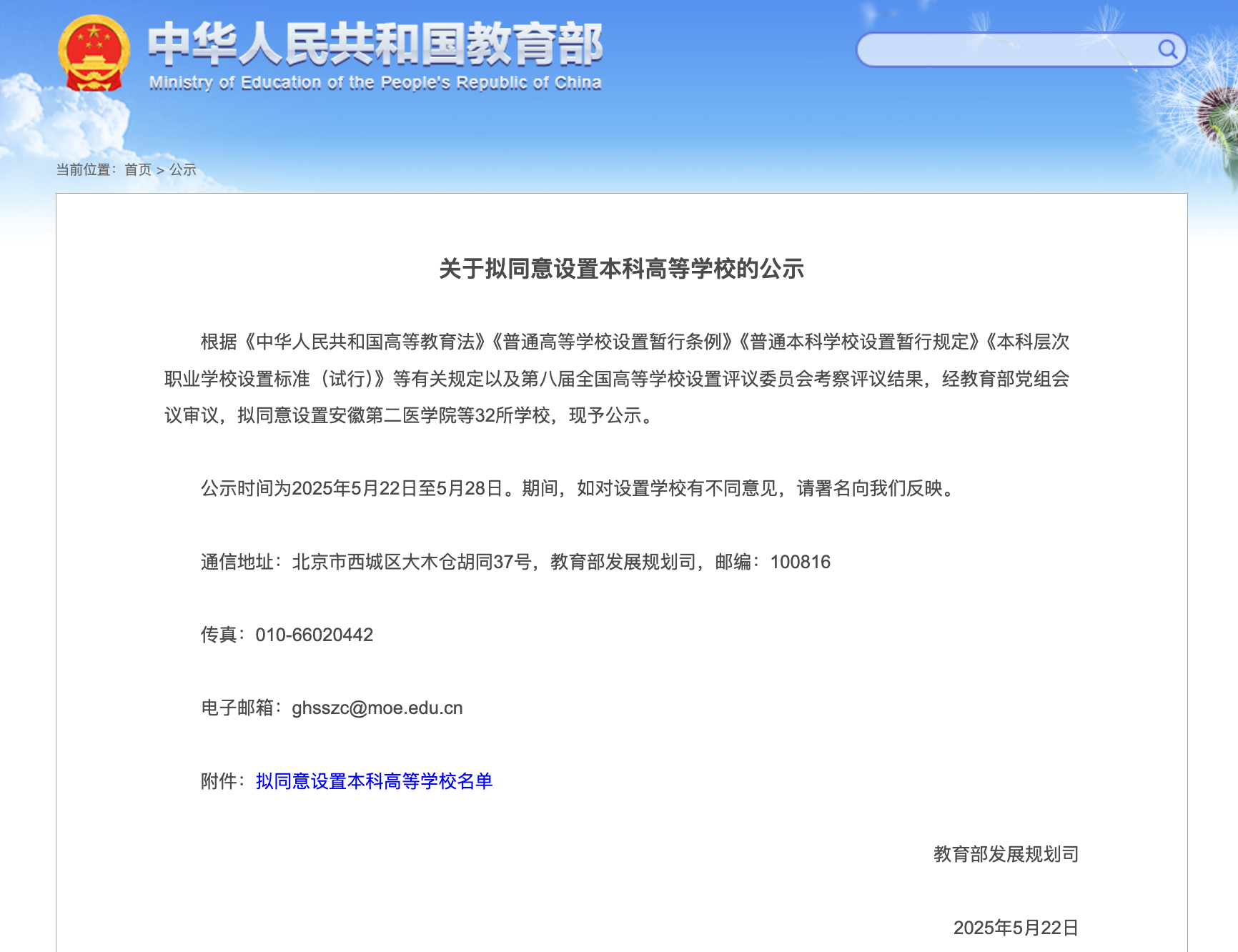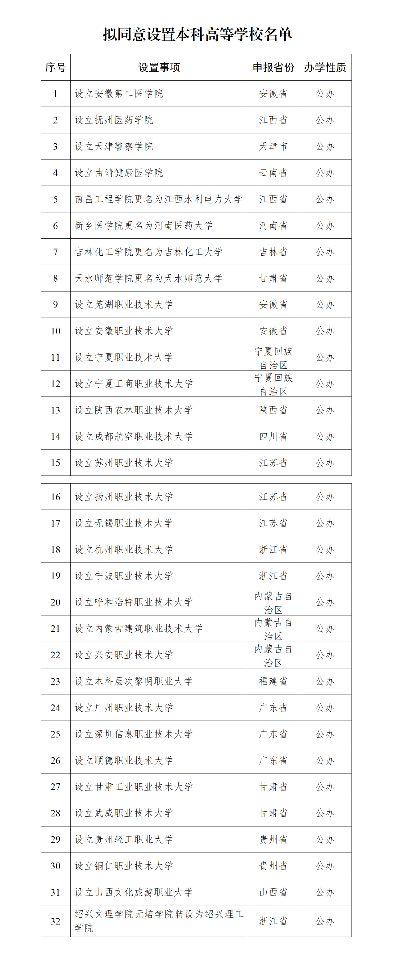 5月22日,教育部發(fā)布“關(guān)于擬同意設(shè)置本科高等學(xué)校的公示”。根據(jù)《中華人民共和國(guó)高等教育法》《普通高等學(xué)校設(shè)置暫行條例》《普通本科學(xué)校設(shè)置暫行規(guī)定》《本科層次職業(yè)學(xué)校設(shè)置標(biāo)準(zhǔn)(試行)》等有關(guān)規(guī)定以及第八屆全國(guó)高等學(xué)校設(shè)置評(píng)議委員會(huì)考察評(píng)議結(jié)果,經(jīng)教育部黨組會(huì)議審議,擬同意設(shè)置安徽第二醫(yī)學(xué)院等32所學(xué)校,現(xiàn)予公示。