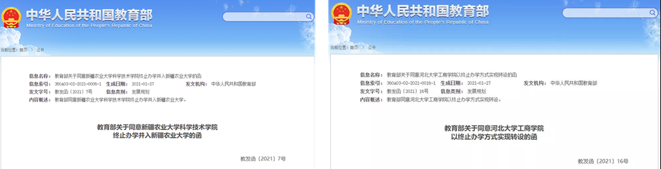 河北大學工商學院為“終止辦學”,新疆農(nóng)業(yè)大學科學技術學院則為“并入新疆農(nóng)業(yè)大學”。