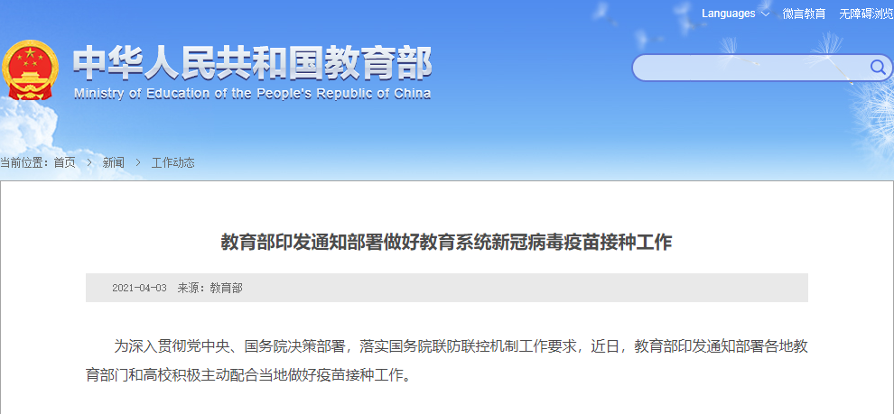 教育部印發(fā)通知部署 做好教育系統(tǒng)新冠病毒疫苗接種工作