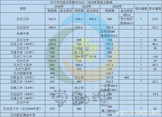 一診成績一出來,家長急的鬢角白。不論是考了多少分,都在焦慮地交流孩子的分數(shù)能報哪個學校。尤其是今年中考新模式實行,跟往年相比又完全沒有參照系,著實急煞了相當一批家長。小編搜集整理了蘭州市近三年絕大多數(shù)普通高中的中考錄取分數(shù)線(部分高中未公布),給大家分析一下各主要普高的錄取分數(shù)線走勢。近三年來,蘭州市城市四區(qū)中考市級示范性高中最低控制分數(shù)線一直呈上升趨勢,這里釋放了兩個信號:一是中考的整體難度有所降低;二是普高的錄取人數(shù)比例有所下降。