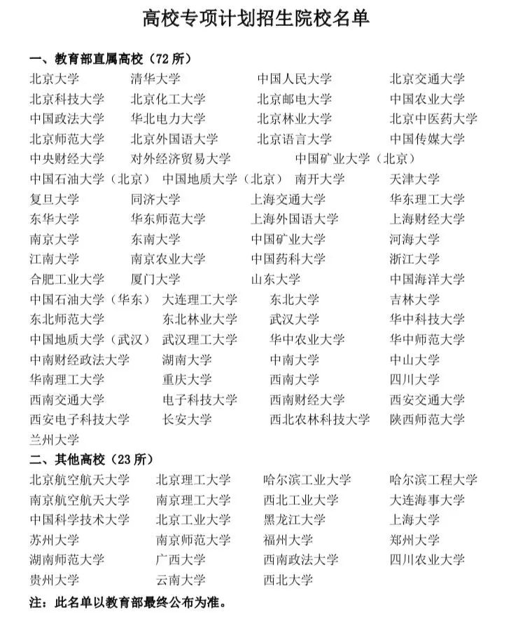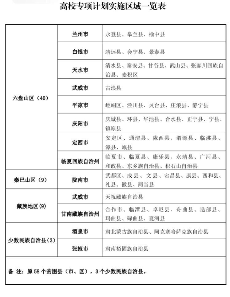 2021年實(shí)施高校專(zhuān)項(xiàng)計(jì)劃的院校由教育部直屬高校和教育部規(guī)定的其他高校承擔(dān)。我省實(shí)施高校專(zhuān)項(xiàng)計(jì)劃的區(qū)域?yàn)槭?nèi)11個(gè)市(州)的原58個(gè)集中連片貧困縣(市、區(qū))及酒泉市肅北蒙古族自治縣、酒泉市阿克塞哈薩克族自治縣、張掖市肅南裕固族自治縣等3個(gè)少數(shù)民族自治縣。