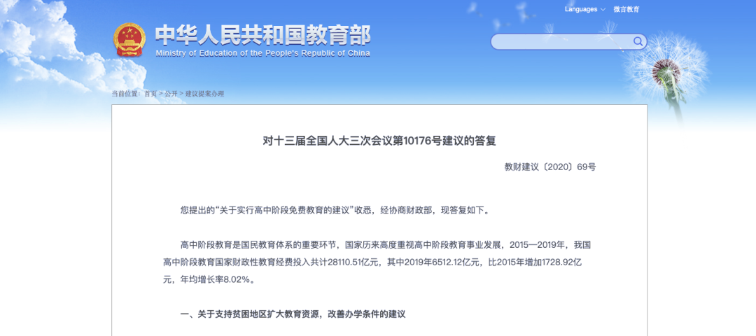近日,針對人大代表提出的“關于全面落實高中階段免費教育,不讓一個學生因家庭貧困而失學的建議”,教育部經(jīng)協(xié)商財政部,在其官網(wǎng)進行答復。具體來看一看↓↓↓