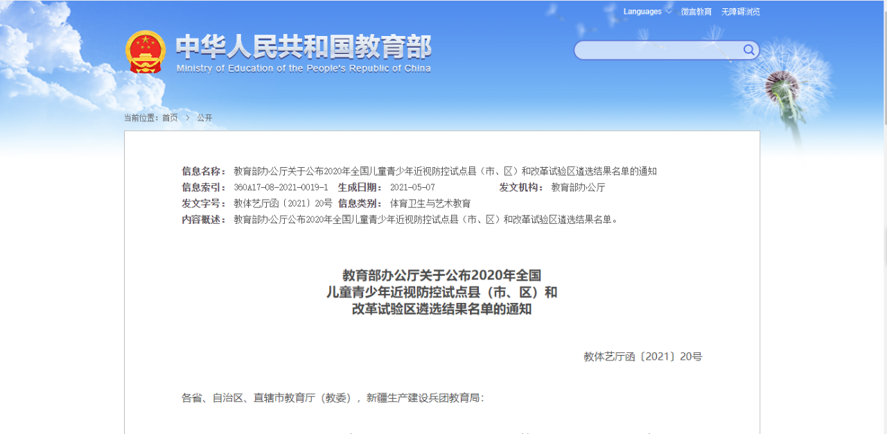 教育部辦公廳關(guān)于公布2020年全國兒童青少年近視防控試點(diǎn)縣(市、區(qū))和改革試驗(yàn)區(qū)遴選結(jié)果名單的通知