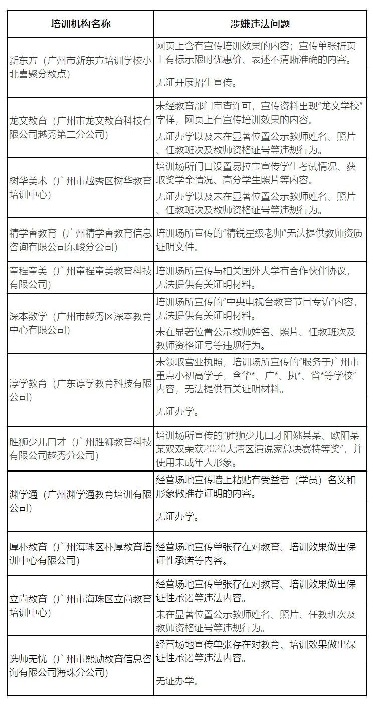 與此同時(shí),教育部門(mén)檢查發(fā)現(xiàn)上述校外培訓(xùn)機(jī)構(gòu)中,部分機(jī)構(gòu)存在無(wú)證辦學(xué),或未在顯著位置公示教師姓名、照片、任教班次及教師資格證號(hào)的行為,依法立案處理。