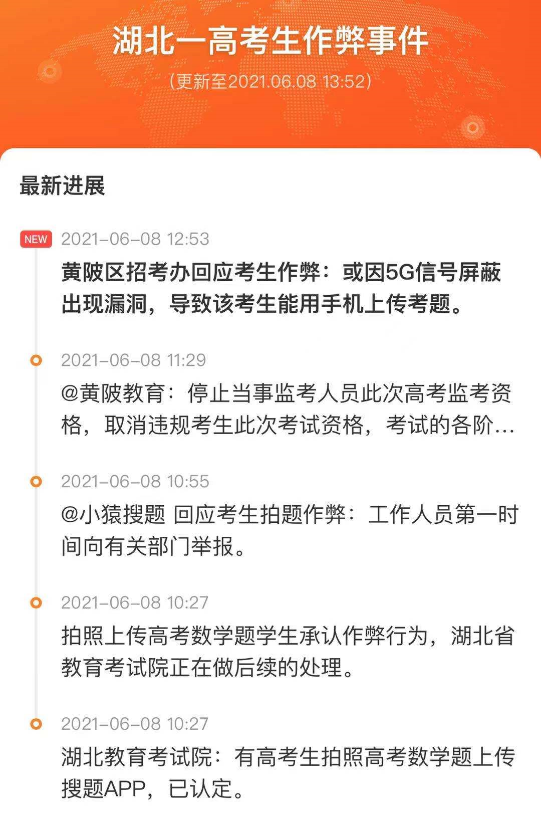 針對網(wǎng)傳湖北考生吳某某將高考數(shù)學題拍照上傳至搜題APP一事,武漢市黃陂區(qū)教育局官方微博發(fā)布通報: