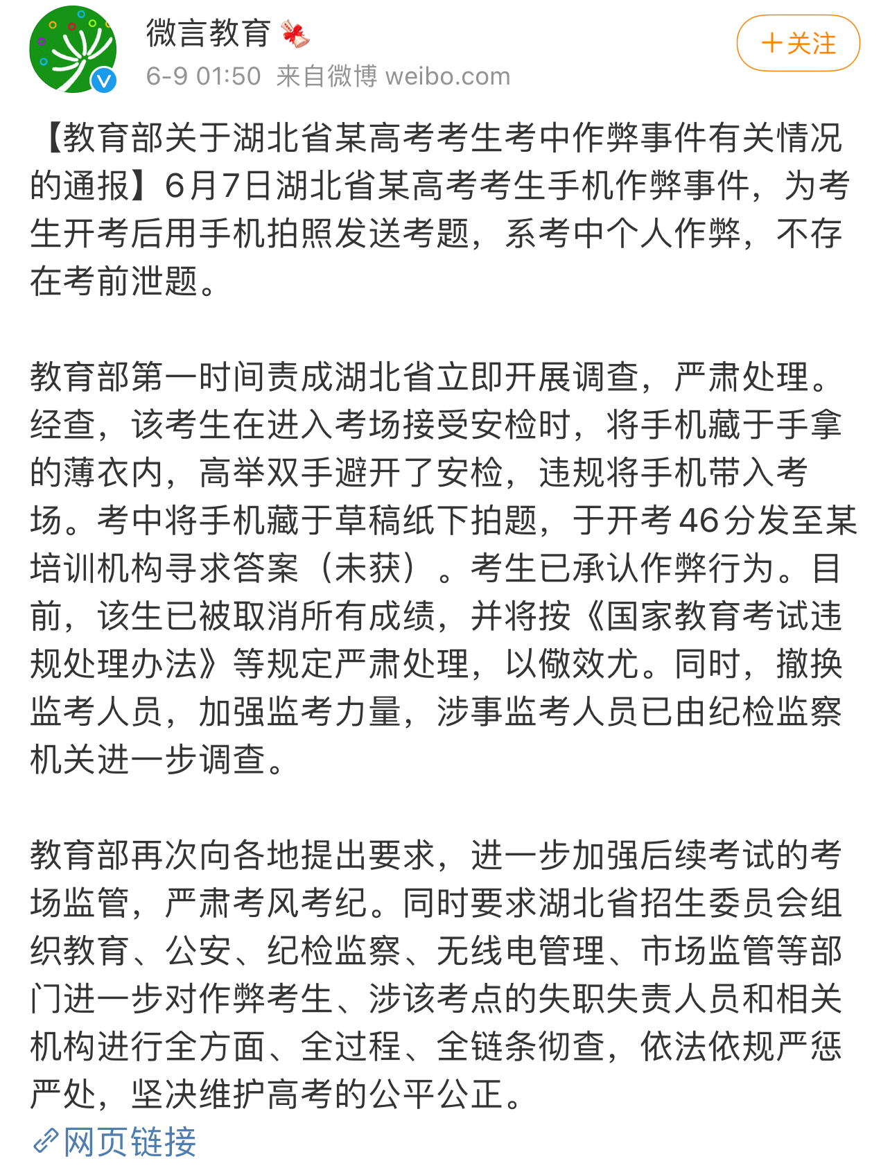 6月9日凌晨2時(shí)許,據(jù)教育部新聞辦公室官方微博@微言教育 通報(bào),6月7日湖北省某高考考生手機(jī)作弊事件,為考生開考后用手機(jī)拍照發(fā)送考題,系考中個(gè)人作弊,不存在考前泄題。通報(bào)稱,教育部第一時(shí)間責(zé)成湖北省立即開展調(diào)查,嚴(yán)肅處理。經(jīng)查,該考生在進(jìn)入考場接受安檢時(shí),將手機(jī)藏于手拿的薄衣內(nèi),高舉雙手避開了安檢,違規(guī)將手機(jī)帶入考場??贾袑⑹謾C(jī)藏于草稿紙下拍題,于開考46分發(fā)至某培訓(xùn)機(jī)構(gòu)尋求答案(未獲)。考生已承認(rèn)作弊行為。目前,該生已被取消所有成績,并將按《國家教育考試違規(guī)處理辦法》等規(guī)定嚴(yán)肅處理,以儆效尤。同時(shí),撤換監(jiān)考人員,加強(qiáng)監(jiān)考力量,涉事監(jiān)考人員已由紀(jì)檢監(jiān)察機(jī)關(guān)進(jìn)一步調(diào)查。教育部再次向各地提出要求,進(jìn)一步加強(qiáng)后續(xù)考試的考場監(jiān)管,嚴(yán)肅考風(fēng)考紀(jì)。同時(shí)要求湖北省招生委員會(huì)組織教育、公安、紀(jì)檢監(jiān)察、無線電管理、市場監(jiān)管等部門進(jìn)一步對作弊考生、涉該考點(diǎn)的失職失責(zé)人員和相關(guān)機(jī)構(gòu)進(jìn)行全方面、全過程、全鏈條徹查,依法依規(guī)嚴(yán)懲嚴(yán)處,堅(jiān)決維護(hù)高考的公平公正。