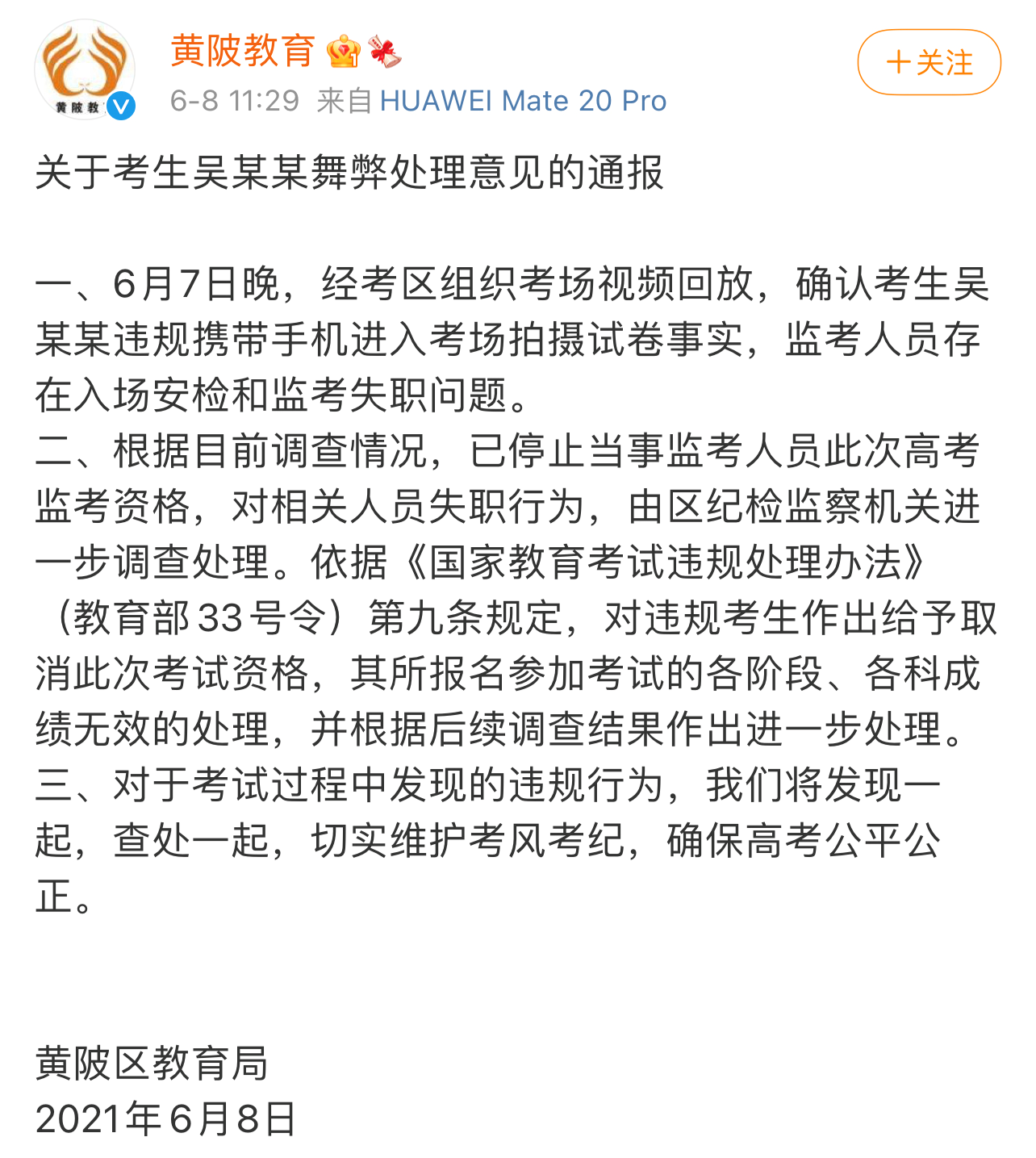 6月8日,武漢市黃陂區(qū)教育局官方微博發(fā)布關(guān)于考生吳某某舞弊處理意見的通報(bào)。通報(bào)稱,7日晚,經(jīng)考區(qū)組織考場視頻回放,確認(rèn)考生吳某某違規(guī)攜帶手機(jī)進(jìn)入考場拍攝試卷事實(shí),監(jiān)考人員存在入場安檢和監(jiān)考失職問題。