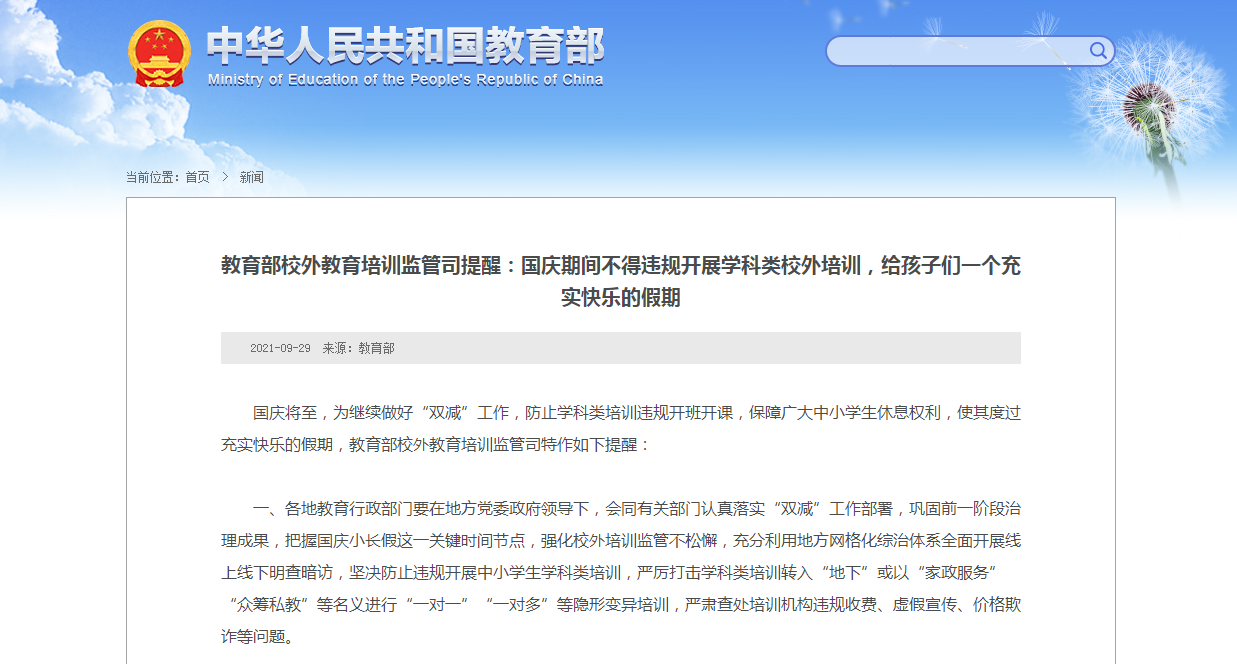 據(jù)教育部網(wǎng)站,國慶將至,為繼續(xù)做好“雙減”工作,防止學科類培訓違規(guī)開班開課,保障廣大中小學生休息權利,使其度過充實快樂的假期,教育部校外教育培訓監(jiān)管司特作如下提醒: