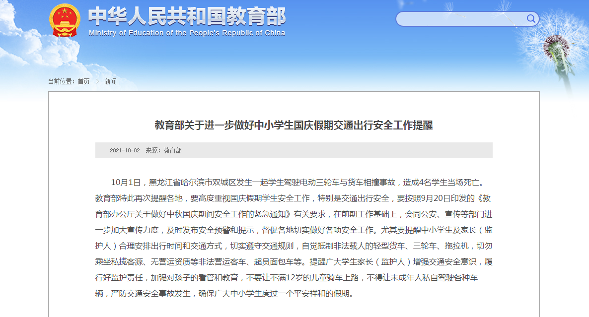 10月1日,黑龍江省哈爾濱市雙城區(qū)發(fā)生一起學生駕駛電動三輪車與貨車相撞事故,造成4名學生當場死亡。教育部特此再次提醒各地,要高度重視國慶假期學生安全工作,特別是交通出行安全,要按照9月20日印發(fā)的《教育部辦公廳關(guān)于做好中秋國慶期間安全工作的緊急通知》有關(guān)要求,在前期工作基礎上,會同公安、宣傳等部門進一步加大宣傳力度,及時發(fā)布安全預警和提示,督促各地切實做好各項安全工作。