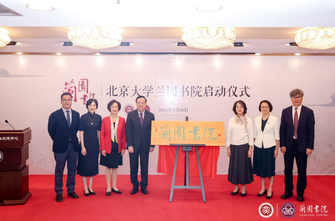 郝平、王博、柯楊、袁明、吳虹、外國語學(xué)院法語系主任董強(qiáng)教授、蘭園書院執(zhí)行院長鄭如青為蘭園書院揭牌。