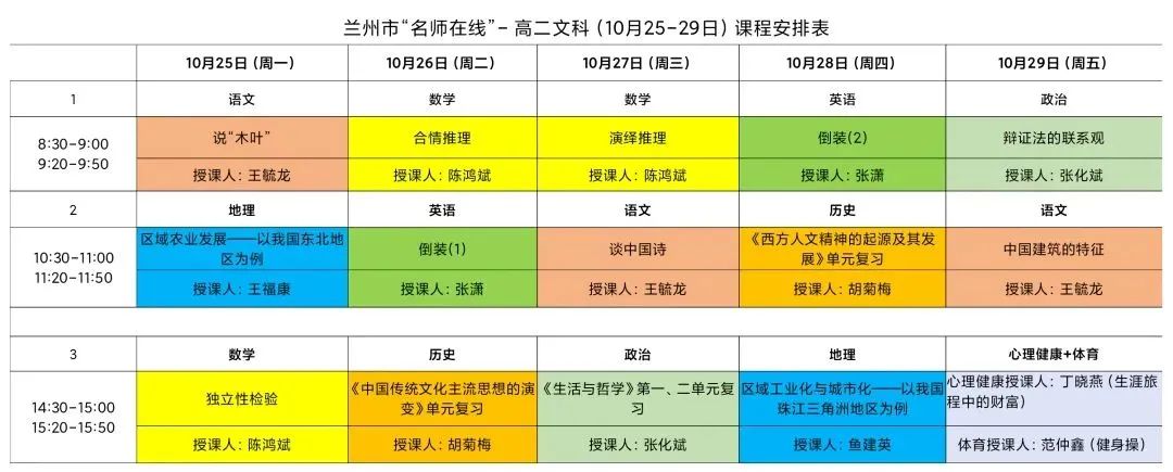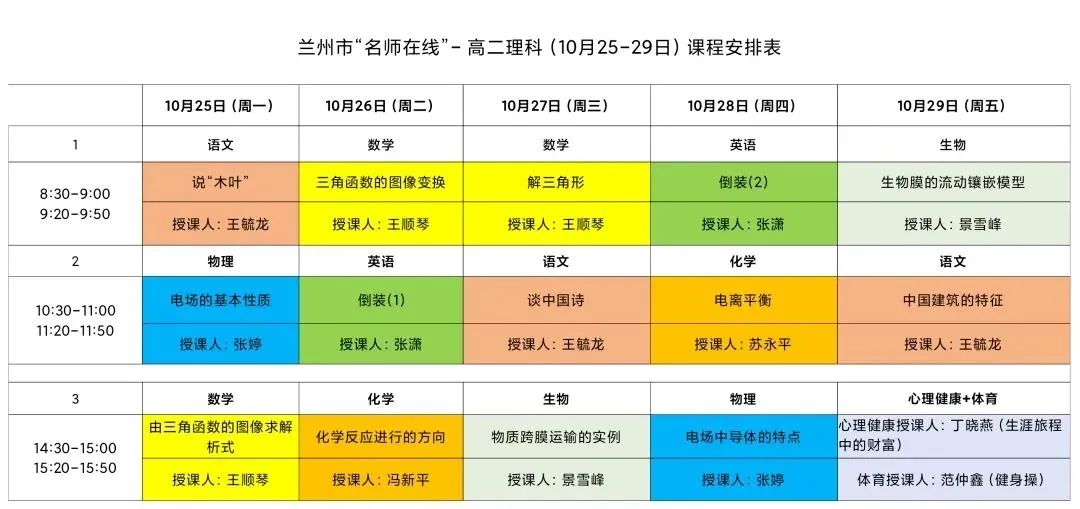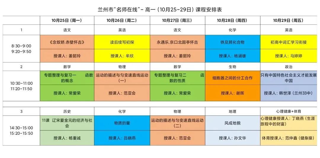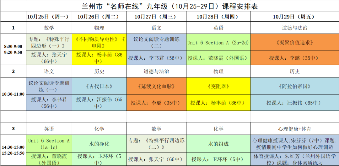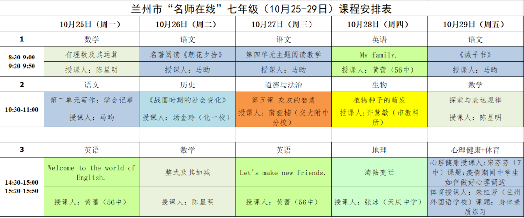 “蘭州智慧教育·名師在線”平臺為各學(xué)校提供七年級至九年級及高一、高二年級的線上教學(xué)課程,10月25日-29日具體課程安排如下: