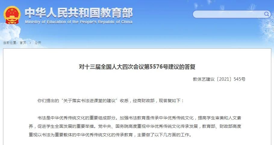 你們提出的“關(guān)于落實(shí)書法進(jìn)課堂的建議”收悉,經(jīng)商財(cái)政部,現(xiàn)答復(fù)如下: