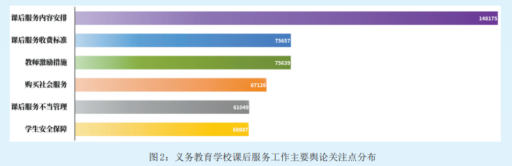 綜合媒體報道評論、業(yè)界聲音及網(wǎng)友意見,圍繞課后服務(wù),輿論關(guān)注點主要集中在課后服務(wù)內(nèi)容安排、課后服務(wù)收費標準、教師激勵措施等6個方面。(見圖2)