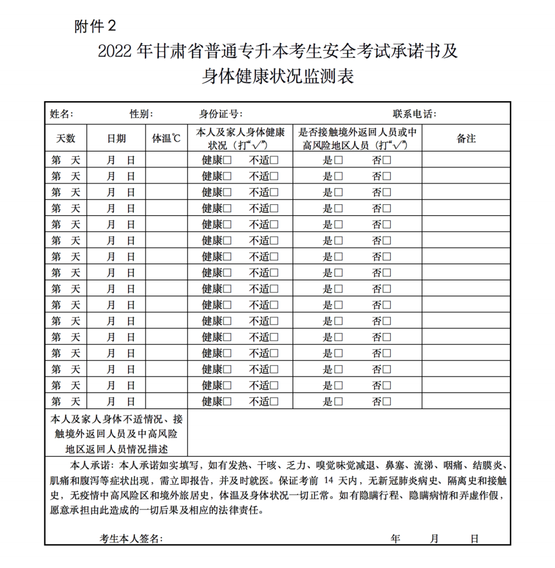 2. 2022年甘肅省普通專升本考生安全考試承諾書(shū)及身體健康狀況監(jiān)測(cè)表