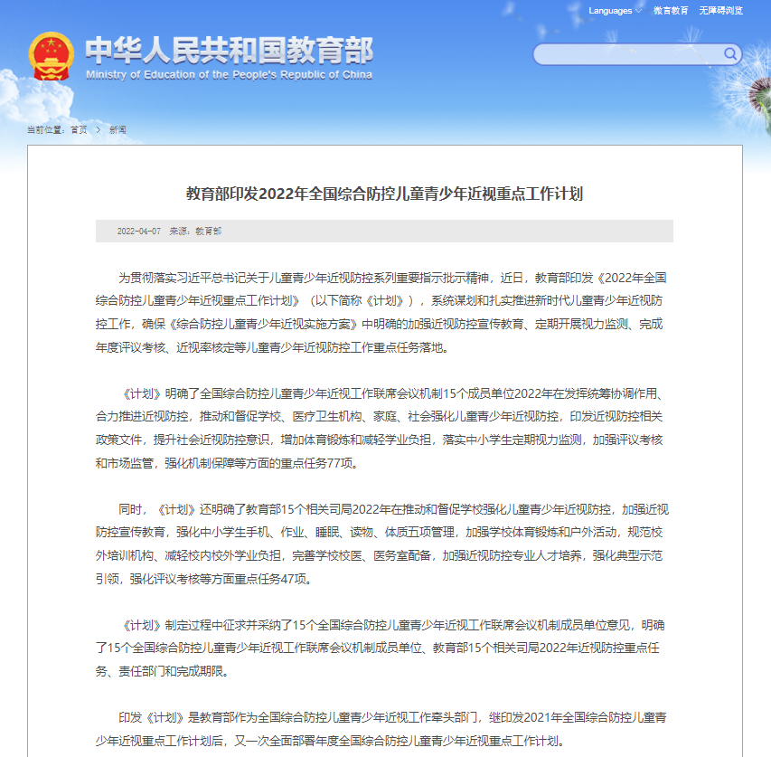 為貫徹落實(shí)習(xí)近平總書記關(guān)于兒童青少年近視防控系列重要指示批示精神,近日,教育部印發(fā)《2022年全國綜合防控兒童青少年近視重點(diǎn)工作計(jì)劃》(以下簡稱《計(jì)劃》),系統(tǒng)謀劃和扎實(shí)推進(jìn)新時(shí)代兒童青少年近視防控工作,確?!毒C合防控兒童青少年近視實(shí)施方案》中明確的加強(qiáng)近視防控宣傳教育、定期開展視力監(jiān)測、完成年度評(píng)議考核、近視率核定等兒童青少年近視防控工作重點(diǎn)任務(wù)落地。