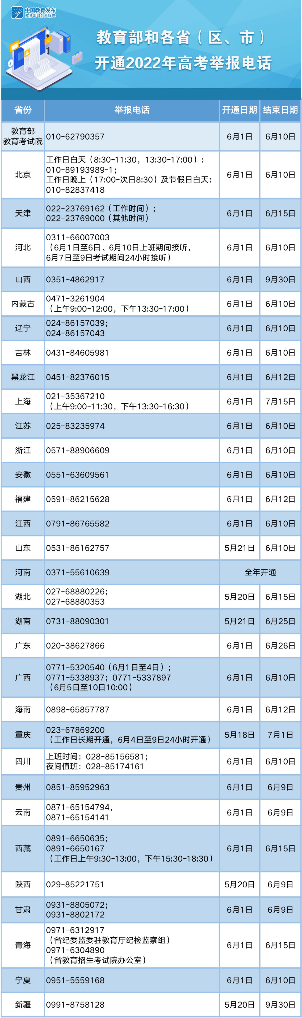 近日,教育部統(tǒng)一公布了教育部以及省級(jí)教育行政部門和招生考試機(jī)構(gòu)2022年的高考舉報(bào)電話,歡迎廣大考生、家長(zhǎng)及社會(huì)各界人士及時(shí)舉報(bào)反映涉及2022年高考的問(wèn)題線索。教育部及各?。▍^(qū)、市)將會(huì)同有關(guān)部門根據(jù)舉報(bào)線索第一時(shí)間核查處理,堅(jiān)決維護(hù)高考公平公正。