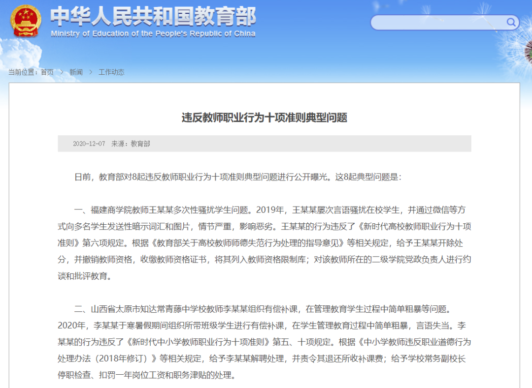 12月7日,教育部在官網(wǎng)“工作動(dòng)態(tài)”板塊對(duì)8起違反教師職業(yè)行為十項(xiàng)準(zhǔn)則典型問題進(jìn)行公開曝光,其中,涉及高校有3起。