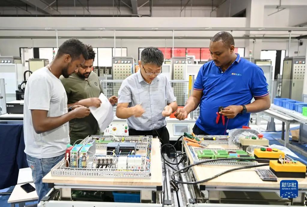 在天津職業(yè)技術(shù)師范大學(xué),老師帶領(lǐng)韓士蘭(右一)和其他留學(xué)生進行實訓(xùn)操作(2022年7月29日攝)。今年38歲的韓士蘭來自埃塞俄比亞,3年前,他來到天津,在天津職業(yè)技術(shù)師范大學(xué)攻讀教育學(xué)博士。新華社記者 李然 攝