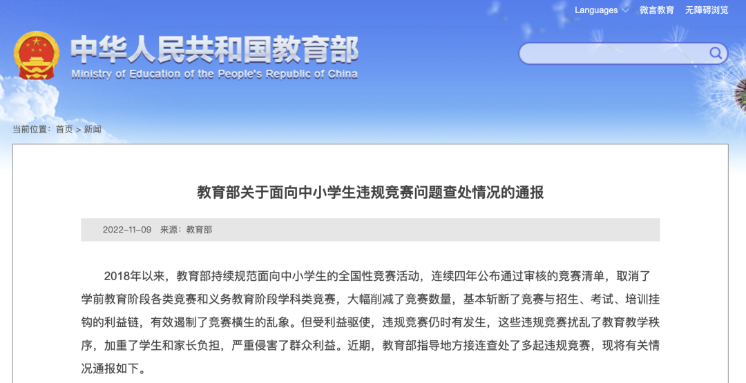 11月9日,教育部發(fā)布關(guān)于面向中小學(xué)生違規(guī)競賽問題查處情況的通報。
