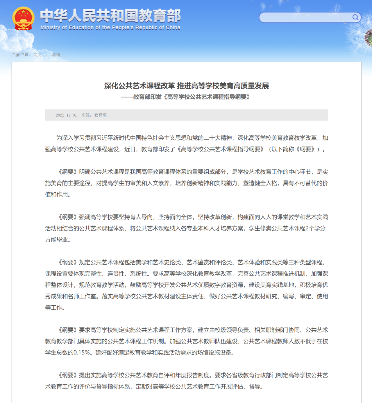 近日,教育部印發(fā)《高等學(xué)校公共藝術(shù)課程指導(dǎo)綱要》(以下簡(jiǎn)稱《綱要》)。