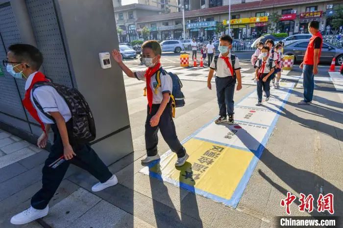 資料圖:??谑心承W的學生有序排隊進入校門。駱云飛 攝