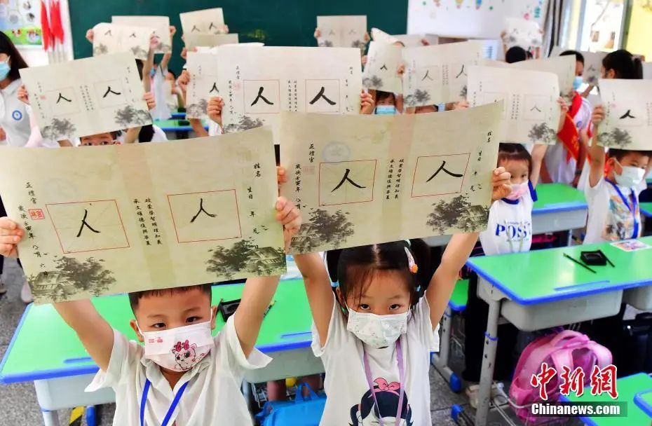 資料圖:福州市某小學一年級新生展示書寫的“人”字。張斌 攝