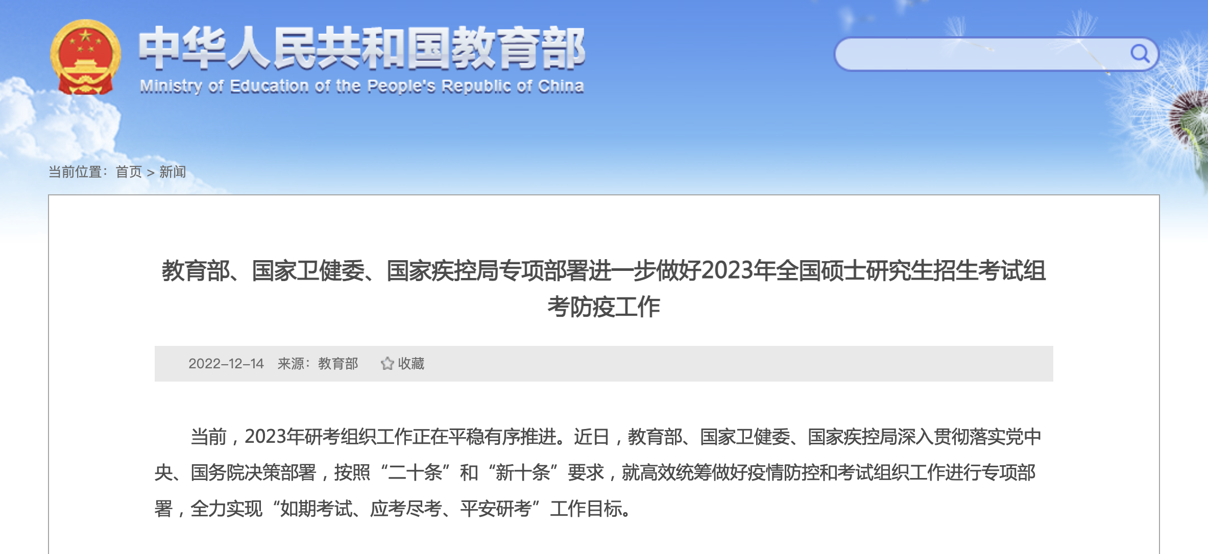 教育部、國(guó)家衛(wèi)健委、國(guó)家疾控局專項(xiàng)部署進(jìn)一步做好2023年全國(guó)碩士研究生招生考試組考防疫工作