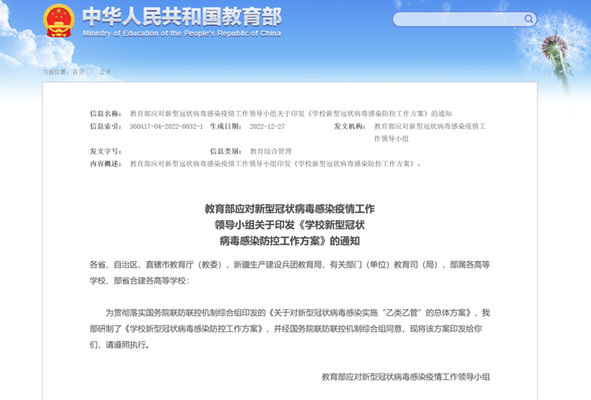 據(jù)教育部官網(wǎng),近日,為貫徹落實(shí)國務(wù)院聯(lián)防聯(lián)控機(jī)制綜合組印發(fā)的《關(guān)于對新型冠狀病毒感染實(shí)施“乙類乙管”的總體方案》,教育部發(fā)布了