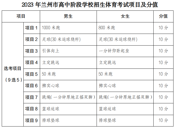 根據(jù)上級(jí)教育行政部門(mén)有關(guān)要求,全省各市(州)2023年高中階段學(xué)校招生體育考試采取在規(guī)定項(xiàng)目?jī)?nèi)自選的方式進(jìn)行。蘭州市2023年體育考試項(xiàng)目在9項(xiàng)內(nèi)自選5項(xiàng),選考項(xiàng)目和分值見(jiàn)下表,總分值定為50分,評(píng)分標(biāo)準(zhǔn)、考試時(shí)間與往年一致,以考生各項(xiàng)目實(shí)際得分之和計(jì)入中考總成績(jī)。