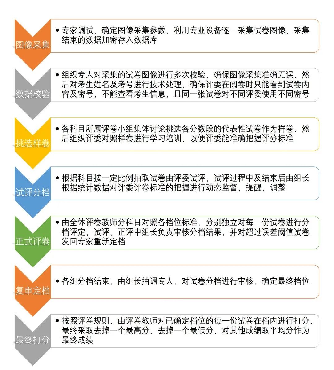 評卷分美術(shù)、書法、唐卡三個專業(yè)進(jìn)行。整個評卷流程分七步:第一步,試卷圖像采集。由專家調(diào)試、確定圖像采集參數(shù),利用專業(yè)設(shè)備逐一采集試卷圖像,采集結(jié)束的數(shù)據(jù)加密存入數(shù)據(jù)庫。第二步,數(shù)據(jù)校驗。組織專人對采集的試卷圖像進(jìn)行多次校驗,確保圖像采集準(zhǔn)確無誤,然后對考生姓名及考號進(jìn)行技術(shù)處理,確保評委在評卷時只能看到試卷內(nèi)容及密號,不能查看考生信息,且同一張試卷對不同評委使用不同密號。第三步挑選樣卷。各科目所屬評卷小組集體討論挑選各分?jǐn)?shù)段的代表性試卷作為樣卷,然后組織評委對照樣卷進(jìn)行學(xué)習(xí)培訓(xùn),以便評委能準(zhǔn)確把握評分標(biāo)準(zhǔn)。第四步,試評分檔。根據(jù)科目按一定比例抽取試卷由評委試評,試評過程中及結(jié)束后由組長根據(jù)統(tǒng)計數(shù)據(jù)對評委評卷標(biāo)準(zhǔn)的把握進(jìn)行動態(tài)監(jiān)督、提醒、調(diào)整。第五步,正式評卷。由全體評卷教師分科目對照各檔位標(biāo)準(zhǔn),獨(dú)立對每一份試卷進(jìn)行分檔評定。試評、正評中組長負(fù)責(zé)審核分檔結(jié)果,并對超過誤差閾值試卷發(fā)回專家重新定檔。第六步,復(fù)審定檔。各組分檔結(jié)束,由組長抽調(diào)專人,對試卷分檔進(jìn)行審核,確定最終檔位。第七步,最終打分。按照評卷規(guī)則,由評卷教師對已確定檔位的每一份試卷在檔內(nèi)進(jìn)行打分。最終采取去掉一個最高分、去掉一個最低分,對其他成績?nèi)∑骄肿鳛樽罱K成績。