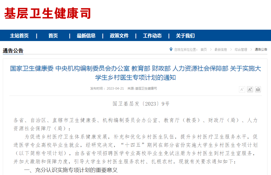 4月21日,國(guó)家衛(wèi)生健康委、中央機(jī)構(gòu)編制委員會(huì)辦公室等5部門聯(lián)合發(fā)布了《關(guān)于實(shí)施大學(xué)生鄉(xiāng)村醫(yī)生專項(xiàng)計(jì)劃的通知》,明確指出,由各省專項(xiàng)招聘醫(yī)學(xué)專業(yè)高校畢業(yè)生,免試注冊(cè)為鄉(xiāng)村醫(yī)生到村衛(wèi)生室服務(wù),并加大激勵(lì)和保障力度。這是引導(dǎo)大學(xué)生鄉(xiāng)村醫(yī)生服務(wù)農(nóng)村、扎根農(nóng)村,解決我國(guó)當(dāng)前鄉(xiāng)村醫(yī)生缺乏,鄉(xiāng)村醫(yī)療衛(wèi)生服務(wù)體系薄弱的有力舉措。全文如下: